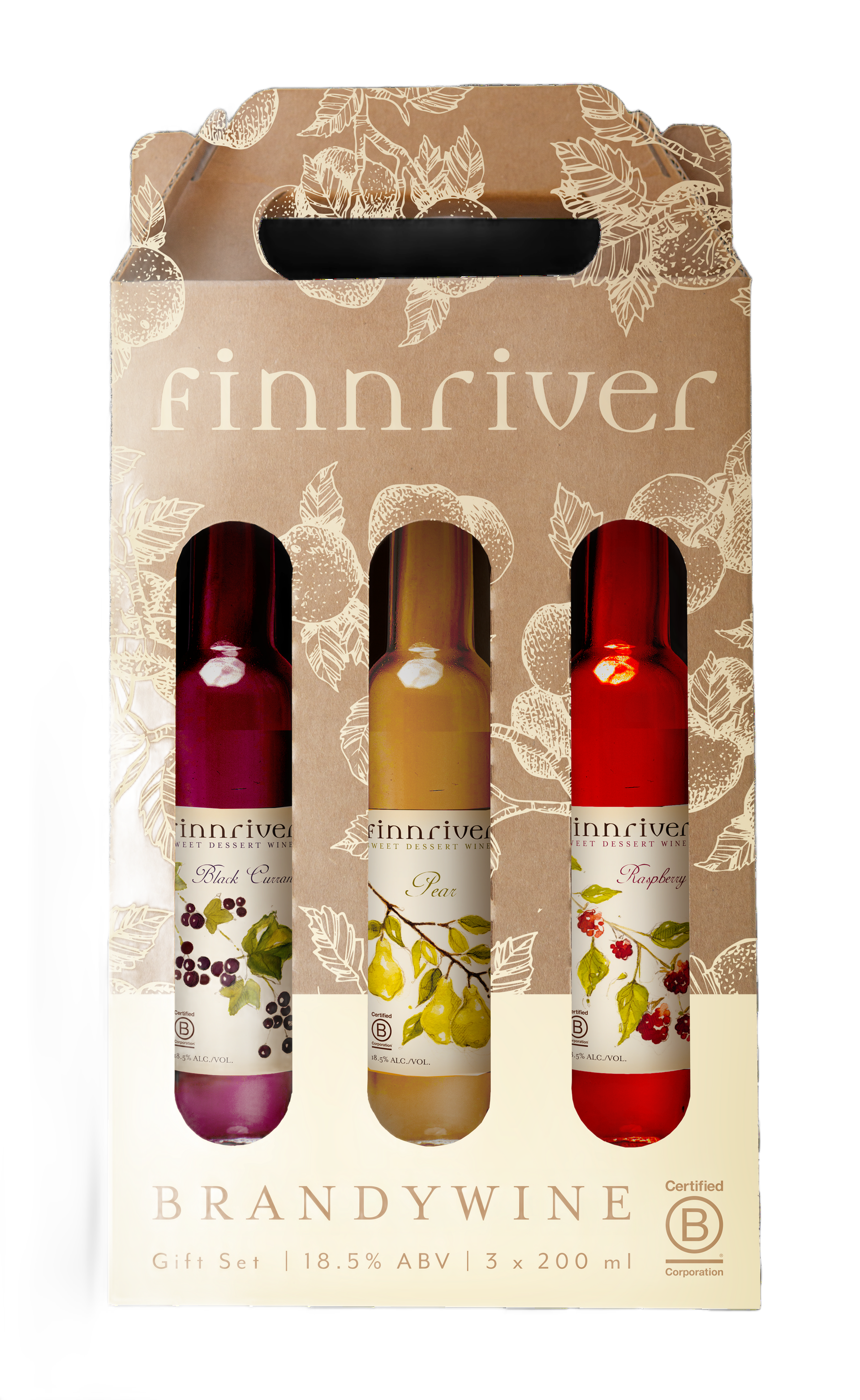 Treat yourself—or someone you love—to a trio of Finnriver’s beloved Brandywines, beautifully packaged for the gift-giving season. Add a splash to champagne or soda water, drizzle over ice cream or cheesecake, or stir into cocktails. A thoughtful gift for anyone who loves craft beverages. Includes Black Currant, Pear, and Raspberry Brandywines.