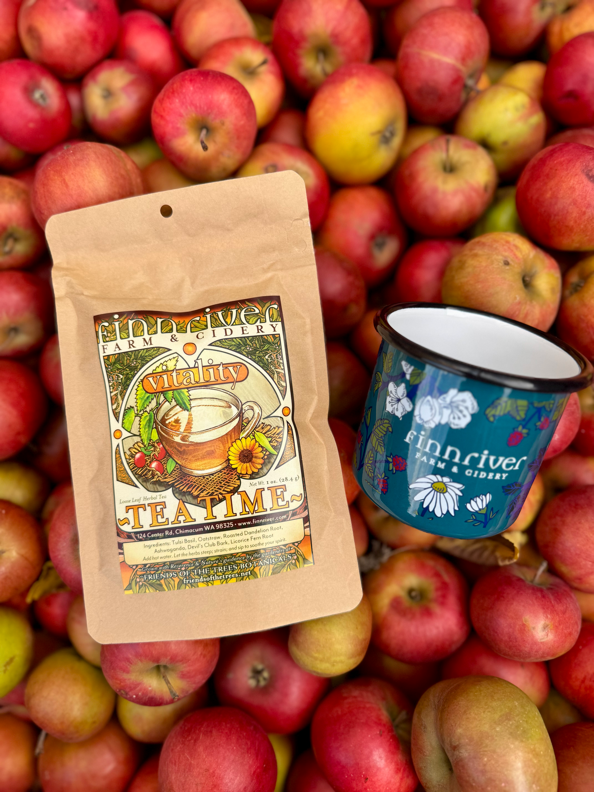 Steep into the season’s stillness with the Self Care Gift Set, crafted to invite slow, cozy mornings and intentionally mellow evenings. This thoughtful pairing includes our Vitality Tea, blended with organic botanicals grown right here on Finnriver's farm by Friends of the Trees Botanicals; one of our land partners. Keep cozy wherever you unwind with our soothing and aromatic herbal tea & charming enamel mug.